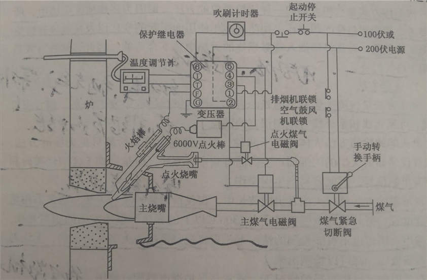 如图所示,在煤气管道上装设紧急切断阀,当排烟机或空气鼓风机发生故障时,便立即切断煤气,以防止爆炸混合物的产生。这种情况下,将联锁控制的排烟机和空气鼓风机启动后,用手动转换手柄打开紧急切断阀,然后把启动停止开关置于“启动”位置上。电源一经接通,吹刷用的计时器便开始动作,仅在规定的时间内进行炉内吹刷,使保护继电器的电源接通。这样一来,继电器内的真空管在短时间内变热,打开点火煤气电磁阀,开始向点火烧嘴送煤气。同时,向点火变压器送电,在点火烧嘴的火焰口处,开始持续进行电火花便使煤气着火,与此同时,在火焰棒上有电流流过,然后,主煤气电磁阀打开,同时停止放电,恢复到正常运转状态。如果因为某种原因,点火火焰脱火,检测不出来火焰的时候,则在1s以内停止主煤气,重新进行点火操作。当这种状态延续15s以上时,通过复位继电器的作用,使与燃烧有关的电源全部切断,开始吹刷。如果不经过足够的吹刷时间,则电源就不会接通。也就是说,采用一个保护继电器进行自动点火、火焰检测、熄火以及重新吹刷等操作。