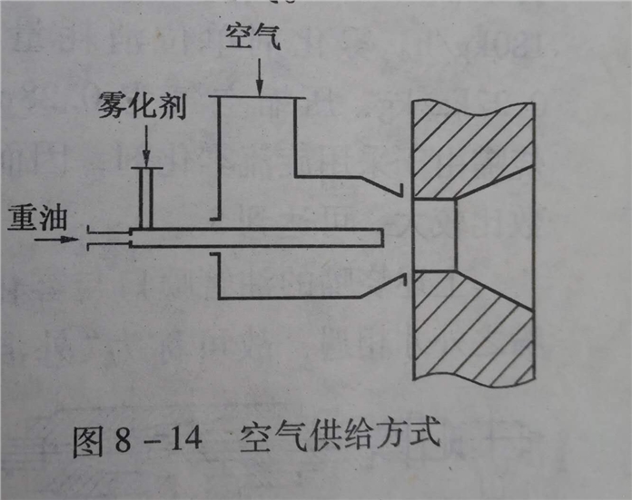 由于高压油烧嘴的燃烧所需空气是用鼓风机另行供给的,如8-14所示,和低压油烧嘴相比,空气与油雾的混合条件较差。因此高压油烧嘴的空气消耗系数要求较大些,约为重油1.20~1.25,火焰较长。由于雾化剂压力较高,喷出速度大,所以火焰的动能较大。在高压烧嘴中,空气的预热温度不受重油裂化的限制。高压烧嘴的能力,小型烧嘴为每小时几十公斤,大型烧嘴可达到每小时几千公斤,调节倍数较大,一般为4~5,高者可达10,且油量变化时,雾化质量影响不大。