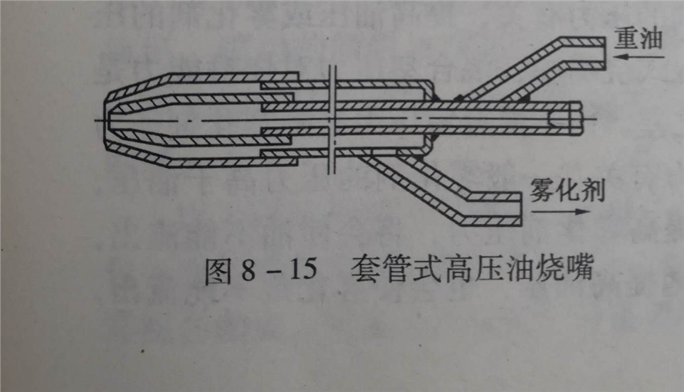 高压油烧嘴不论用蒸汽或用压缩空气作雾化剂,烧嘴本身没有原则区别。结构*简单的高压油烧嘴是套管式高压油烧嘴,如图8-15所示。该烧嘴雾化剂喷口为收缩状,使雾化剂与油流股重油的交角约为25°,以加强雾化。雾化剂的喷出速度低于临界状态下的音速。当雾化剂压力较高时,这种烧嘴可以保证良好的雾化质量;当雾化剂压力较低(例如低于300kPa)时,雾化质量变坏。该烧嘴