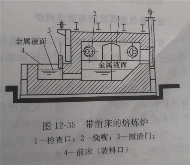 图12—35所示为带有前床的铝熔炼炉。前床部分主要是为了熔炼再生铝而设置的。将废料装入前床,靠熔融液本身的热量来熔化。加热室和前床之间的隔墙用能升降的撇渣门隔开,一边用泵使熔融液在此处循环,一边促使废料熔化。从节省能源的观点来看这是一种日趋普及的炉型。