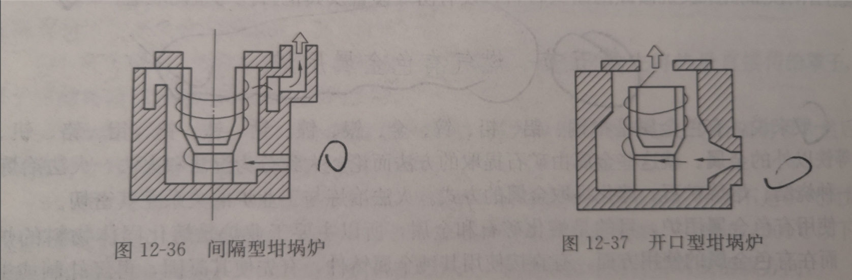 图12—36所示为燃烧废气不与金属直接接触的间隔型坩埚炉。燃烧废气虽不会腐蚀金属,但其热效率要比开口型坩埚炉(图12—37)低很多。