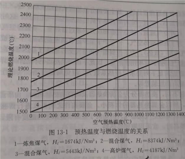 空气和燃气的预热温度越高,带入炉内的物理热越多,燃气的理论燃烧温度越高。这一关系可用图13-1明显地表示出来。由图可知,将空气预热到600~800℃时燃烧高炉煤气,与空气不预热时燃烧Hl=8374kj/Nm3的混合煤气具有同样的燃烧温度。