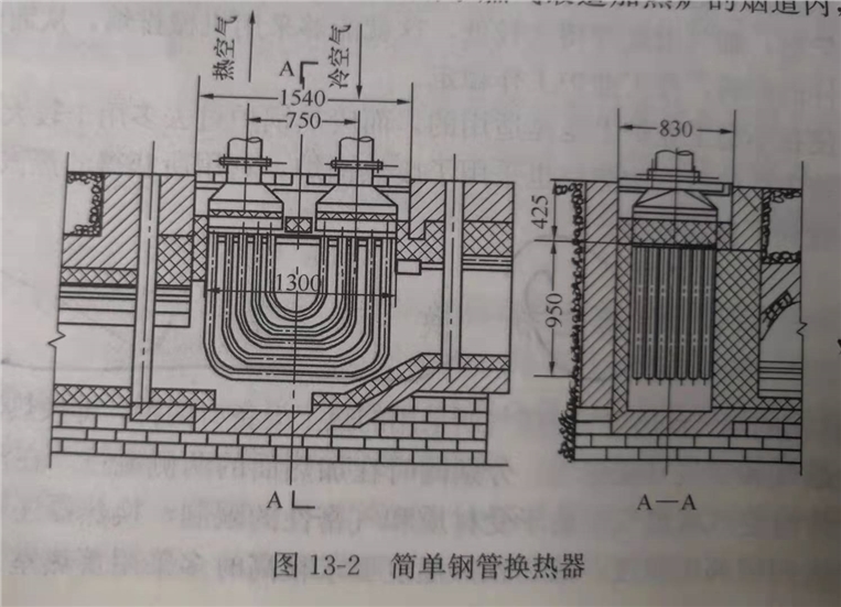 图13-2是内径50mm的钢管换热器,用于燃气锻造加热炉的烟道内,其传热系数为23.3W/(m2∙K)。该换热器的优点是结构简单,缺点是管子长度不同时换热器可能弯曲,甚至被烧坏。