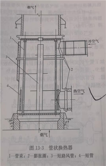 图13-3是另一种管状换热器,烟气通过许多垂直管束1向*动,空气在管外流动。考虑到管子及壳体的膨胀不同,壳体与管子上均设有膨胀圈2.换热器的下部是烟气入口,又是热空气出口,所以该处温度*,为延长换热器寿命,下部可用合金钢管。此外还采取了降温措施,如中间设有一根短路风管3直接送入高温区,冷却底板及换热器下部,然后沿管4向*动与热空气混合后流出换热器。为防止底板被烧坏,底板下吊挂一层耐火材料。每根管子的入口作为渐扩管,这样可减少入口阻力。该换热器在国外被广泛应用。
