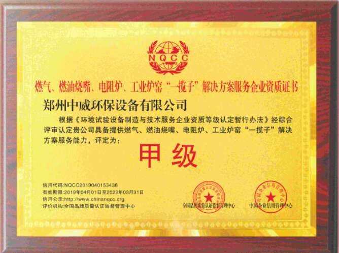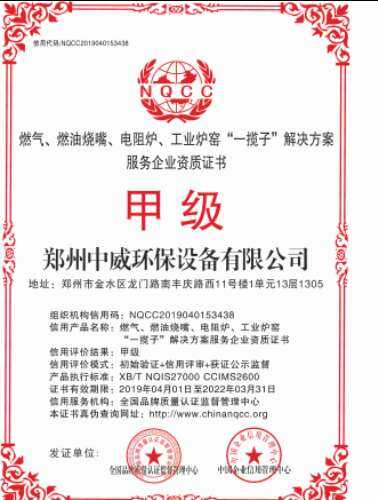 郑州中威环保设备有限公司承接燃气、燃油工业炉窑工程资质证书!