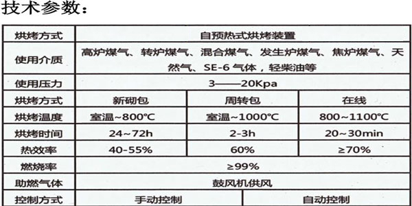 烘烤装置分为在线烘烤装置和离线烘烤装置。烘烤装置对于提高钢铁包温度,对提高钢铁水温度,提高炉体的寿命,増加钢铁产量,降低原材料消耗,降低吨钢成本,保证连铸的顺利进行都具有重要的意义。